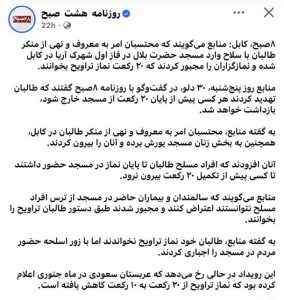 روزنامه هشت صبح در گزارشی مدعی شد که محاسبان امر باالمعروف و نهی از منکر با ورود به مسجد حضرت بلال واقع در فاز اول شهرک آریا (کابل)، نمازگزاران را مجبور به خواندن ۲۰ رکعت نماز تراویح کرده اند.