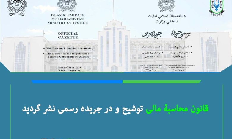کابل-وزارت عدلیه امارت اسلامی افغانستان با انتشار جریده رسمی شماره ۱۴۶۵ در ۱۷ ذیالقعدةالحرام ۱۴۴۶ هجری قمری، دو سند تقنینی کلیدی را توشیح و منتشر کرد: ۱. قانون محاسبۀ مالی (۲۰ ماده) ۲. فرمان تنظیم امور شرکت های امارتی (۱۶ ماده)