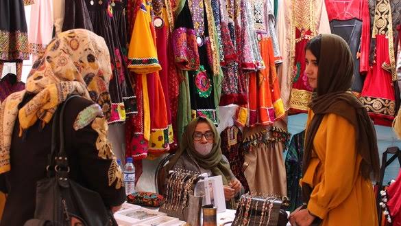 خاطره انوری، مسئول کارگاه صنایع دستی: «بیشتر هنرهای افغانی مانند گلدوزی، سوزن ‌دوزی، قالین‌ بافی و لباس ‌های محلی کار دست بانوان است.