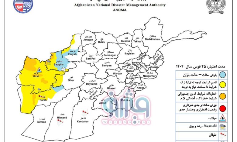 فوزیه صدیقی- بر اساس پیش بینی های ادارهٔ هواشناسی کشور و نهادهای بینالمللی معتبر، احتمال وقوع بارش باران، برف و رعد و برق در ولایت های هرات، فراه، بادغیس، غور و فاریاب وجود دارد.